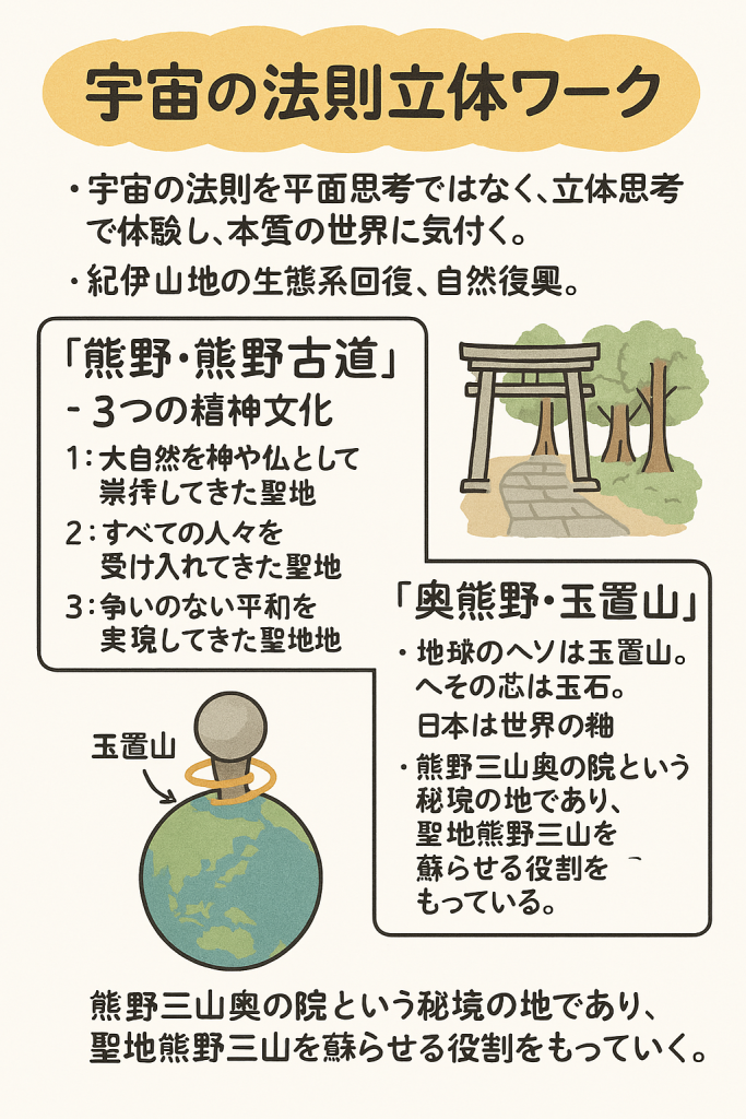 宇宙と繋がる一番近い聖地熊野で人類意識の変容=宇宙の法則を平面思考ではなく立体思考で体験し、本質の世界に気付く。
