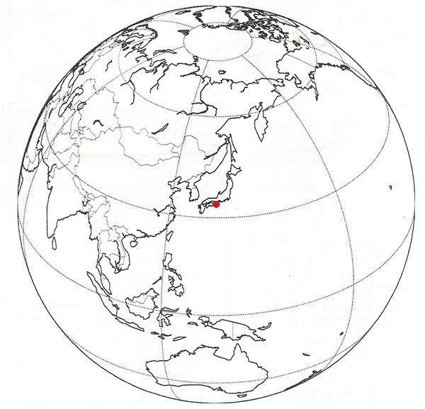 この図では地球儀上に玉置神社の位置を赤い点で示し、そこから地球の中心へ向かう軸を点線で表しました。
